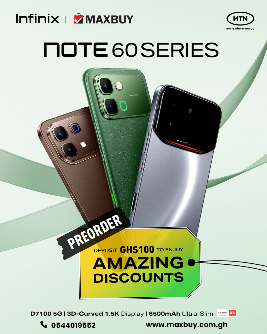 Pre-order the new Infinix Note 60 Series with just GHS100 deposit and enjoy exclusive launch discounts. Experience powerful performance with D7100 5G processor, 6500mAh battery, and stunning 3D-curved 1.5K display.
